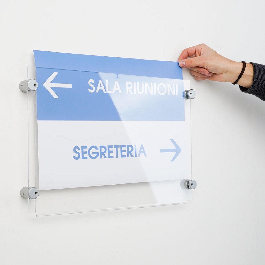 La segnaletica in plexiglass a parete della linea PLEXI è una soluzione moderna e professionale per l’esposizione di targhe informative, identificative e direzionali. Il plexiglass trasparente conferisce un design pulito ed elegante, adatto a qualsiasi ambiente.